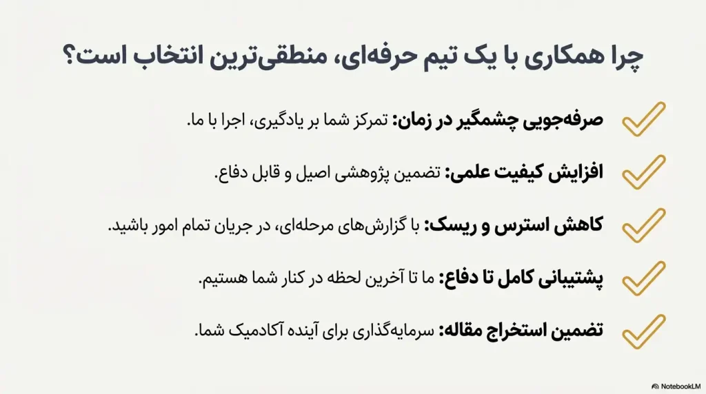 بسیاری از دانشجویان برای جلوگیری از اتلاف زمان و کاهش ریسک، ترجیح میدهند انجام پایان نامه کارشناسی ارشد مهندسی صنایع را با کمک یک تیم حرفهای انجام دهند. مزایای این کار عبارتاند از: