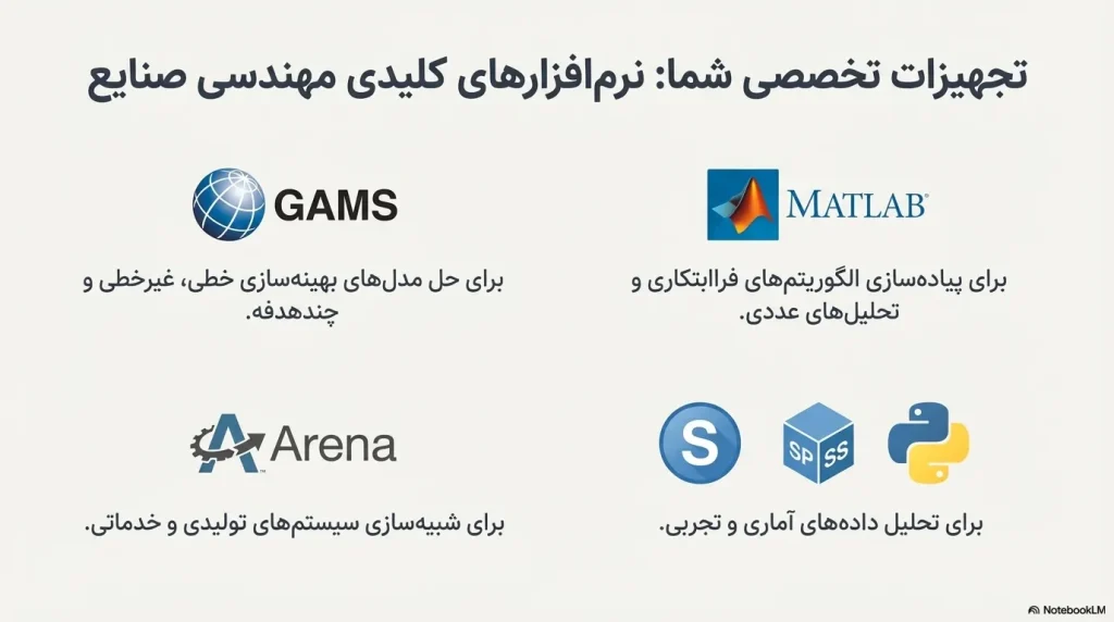 نرمافزارهایی مانند GAMS، MATLAB، Arena، SPSS و Python ابزارهای اصلی در انجام پایان نامه کارشناسی ارشد مهندسی صنایع هستند و تسلط بر آنها ضروری است.