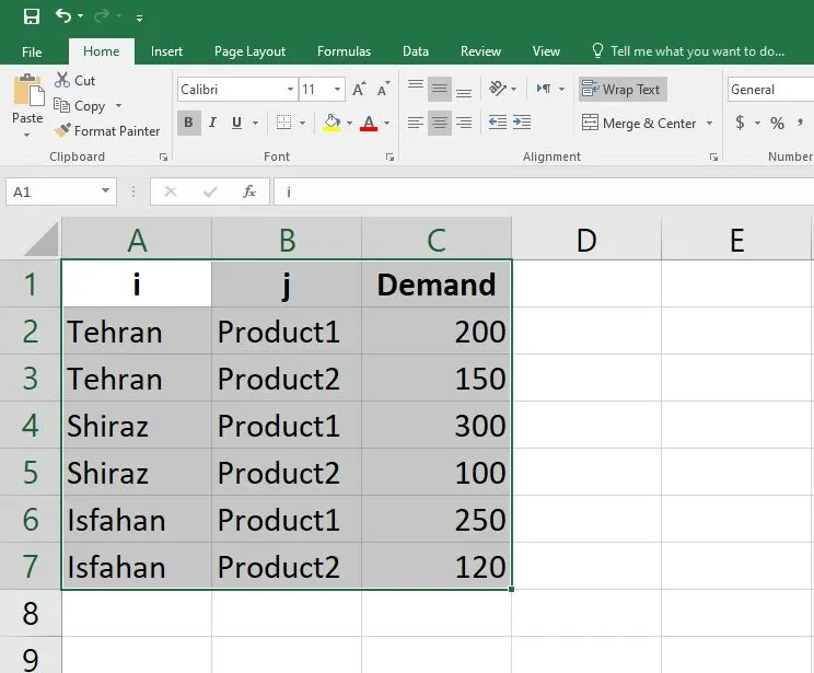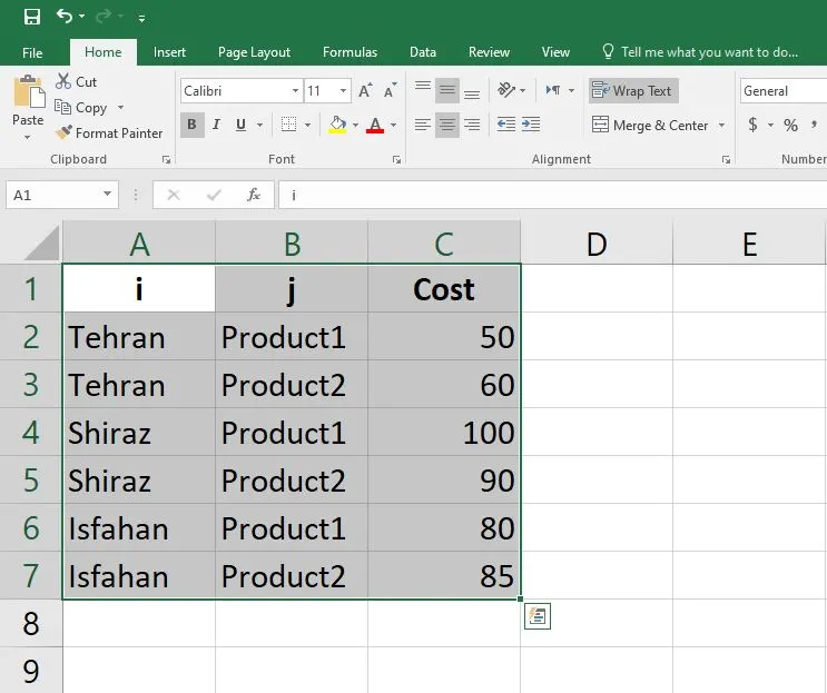 برای این آموزش، یک مسئله حملونقل چندمحصولی را مدل میکنیم که در آن متغیرهای باینری تصمیم میگیرند کدام مسیرها (شهر-محصول) استفاده شوند. دادهها از اکسل وارد میشوند.